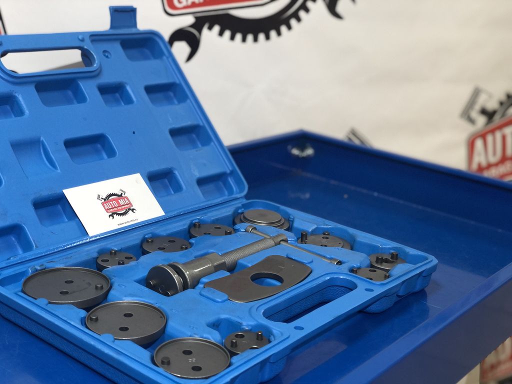 Набор предназначен для вдавливания поршней тормозных цилиндров автомобилей с дисковыми тормозами. Позволяет избежать повреждения манжет и поршней суппорта.